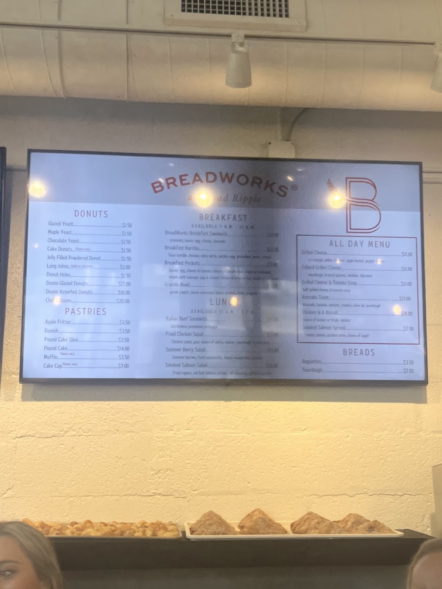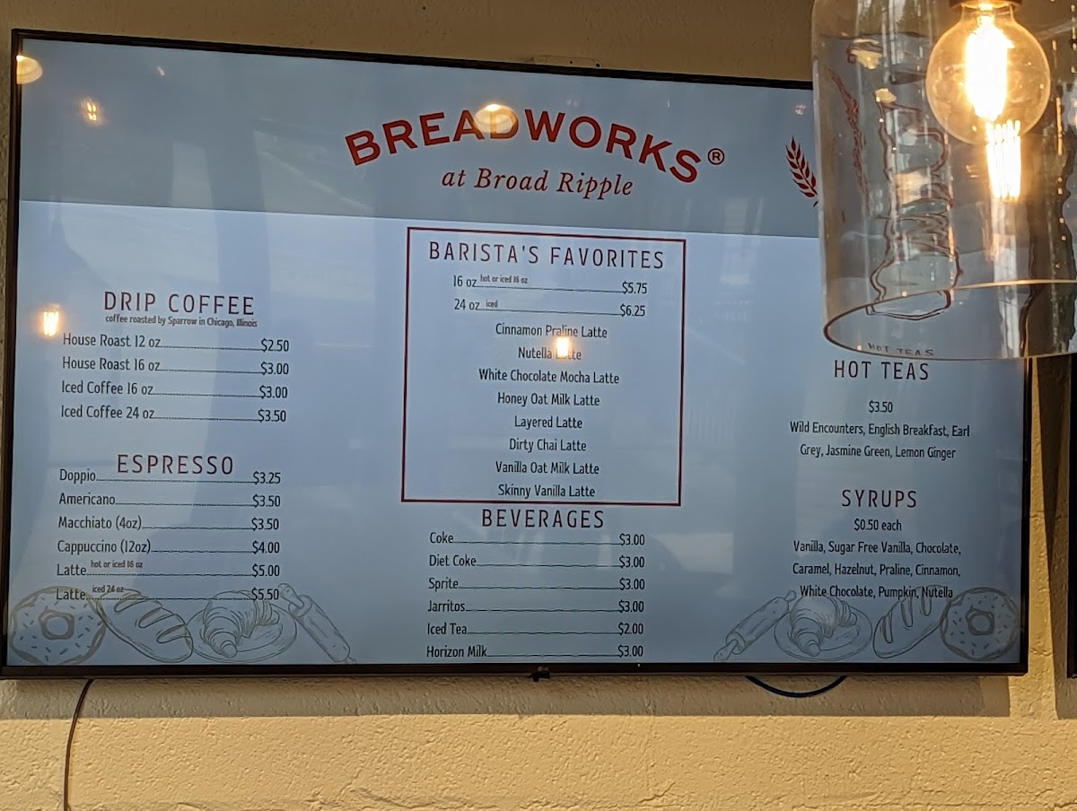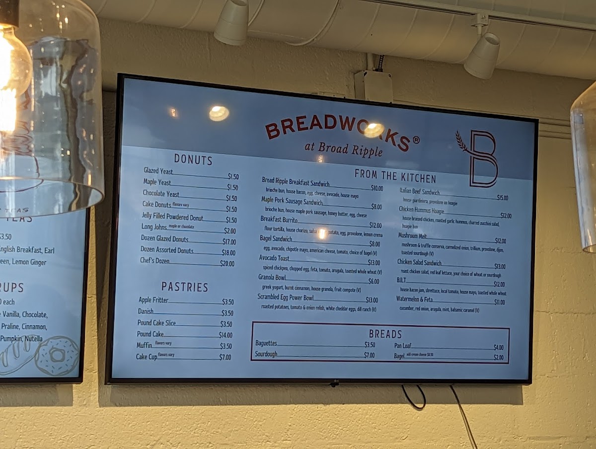 From a reviewer’s perspective, the menu at Breadworks At Broad Ripple offers a well-rounded selection of coffee, breakfast items, and baked goods that make it a reliable spot for both a quick drink and a light meal. The espresso menu features classics like Doppio, Americano, Macchiato, Cappuccino, and Latte, while the Barista’s Favorites-such as the Horchata Latte, Nutella Latte, Dirty Chai Latte, Honey Oat Milk Latte, and Vanilla Oat Milk Latte-add creative variety. The bakery side is equally appealing, with donuts like Glazed Yeast, Maple Yeast, Chocolate Yeast, Cake Donuts, and the Jelly Filled Powdered Donut, alongside pastries such as Apple Fritter, Pound Cake Slice, Muffin, and Cake Cup. For something more filling, the Broad Ripple Breakfast Sandwich, Breakfast Burrito, Scrambled Egg Power Bowl, and Avocado Toast stand out among the Broad Ripple Favorites, and the Build Your Own Breakfast Sandwich option adds flexibility. With staple breads like Baguette, Sourdough, Pan Loaf, and Bagel, plus a range of teas and beverages, the menu feels thoughtfully curated, balancing simple staples with flavorful specialties.